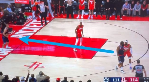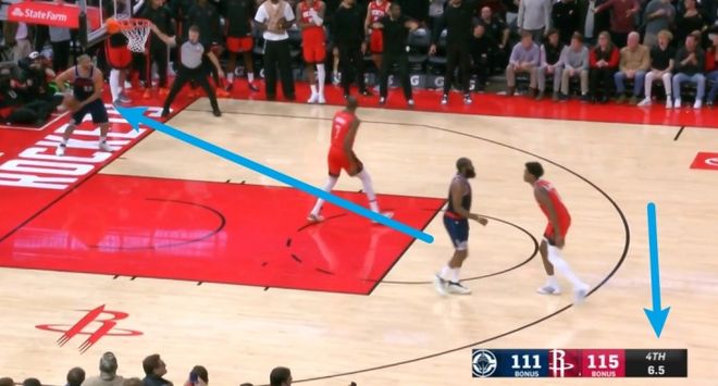 在最后时刻,哈登两次让队友去接球,自己没回头并且队友反应慢。第一次是哈登指挥队友去接球,小卡跑回来接,但是巴图姆踩线失误了。