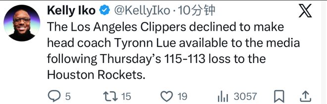 Kelly Iko写道:“洛杉矶快船队在周四以115比113负于休斯顿火箭队后,球队没有让泰伦-卢接受媒体采访”。